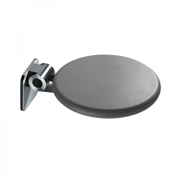 Dusch-Klappsitz aus hautsympathischem, hygienischem PUR und Edelstahl fein matt, mit drehbarer Sitzfläche aus PUR, Ø 400 mm, mit federunterstützter Klappfunktion für leichte Bedienung, belastbar bis 150 kg, verdeckte Befestigung durch Abdeckblende aus Edelstahl fein matt, Wandhalterung aus Aluminium schwarz-grau (RAL 7021), 160 x 160 mm, inkl. Befestigungsmaterial für massives Mauerwerk
