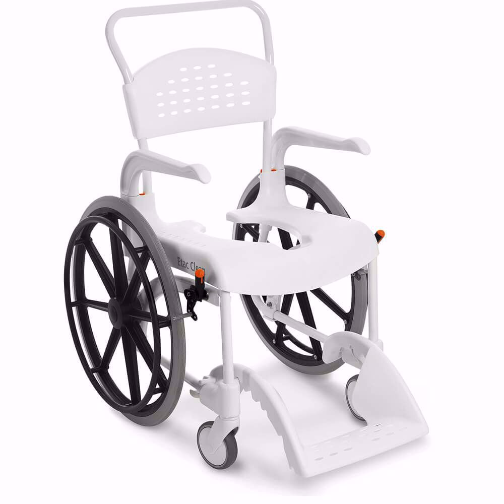 Die grossen Antriebsräder ermöglichen aktiven Nutzern das leichte Manövrieren im Bad. Der Dusch- und Toilettenstuhl Clean 24" hat alle Vorzüge des Standardmodells – den nach hinten offenen Sitz, abschwenkbare Armlehnen, die praktische Fussplatte usw. Darüber hinaus sind die Feststellbremsen leicht erreichbar und verschwinden unter der Sitzkante, wenn sie angezogen werden. Umfangreiches Zubehör ist auch für den Dusch- und Toilettenstuhl Clean 24" erhältlich. Die arretierbaren Armlehnen können nach aussen geschwenkt oder abgenommen werden. So wird der Transfer wesentlich erleichtert. Die leicht gewölbte Form des Fussbretts gibt auch nackten Füssen sicheren Halt. Eine besondere seitliche Ausformung schützt die Füsse vor dem Schwenkbereich der vorderen Räder. Die grossen Antriebsräder ermöglichen aktiven Nutzern das leichte Manövrieren im Bad.