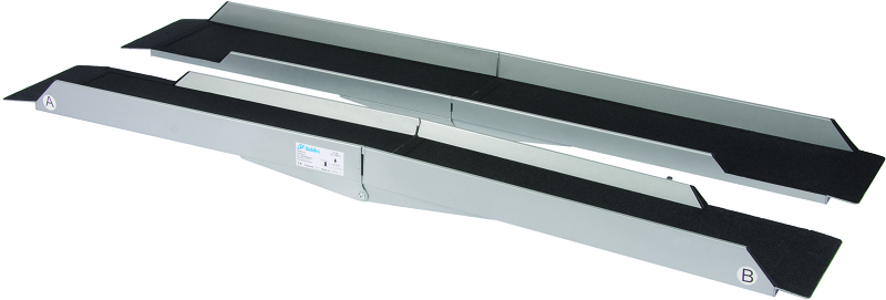 Die Auffahrrampe von Mobilex besteht aus zwei Auffahr-Schienen, welche mittig faltbar sind und wie ein Koffer aufgrund der integrierten Griffe getragen werden können. Die Rampen bestehen aus Aluminium und sind mit einem Friktionsbelag beschichtet.