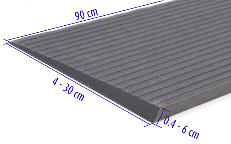 Die Gummirampe von Mobilex eignet sich perfekt zum Ausgleich von Schwellen. Die Türschwellenrampe gibt es in vielen unterschiedlichen Höhen (Masse in cm). Die Breite der Rampe kann zudem mit einem Cutter oder Sägeblatt ohne Probleme angepasst werden. Nach dem Abziehen der Schutzfolie ist die Gummirampe bereit zur Anbringung.