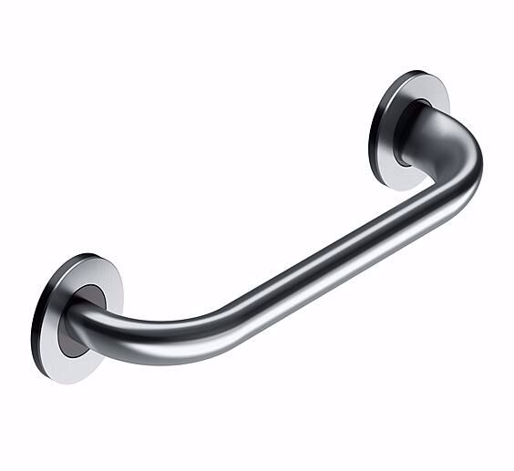 Haltegriff aus Edelstahl fein matt, für optimales Greifen und Stützen, Handgreifform elliptisch durch Ovalrohr 36,5 x 22 mm mit 45°-Schrägstellung, verdeckte Befestigung durch Abdeckblenden aus Edelstahl fein matt, Wandhalterungen aus Aluminium schwarz-grau (RAL 7021), Ø 70 mm, inkl. Befestigungsmaterial für massives Mauerwerk.