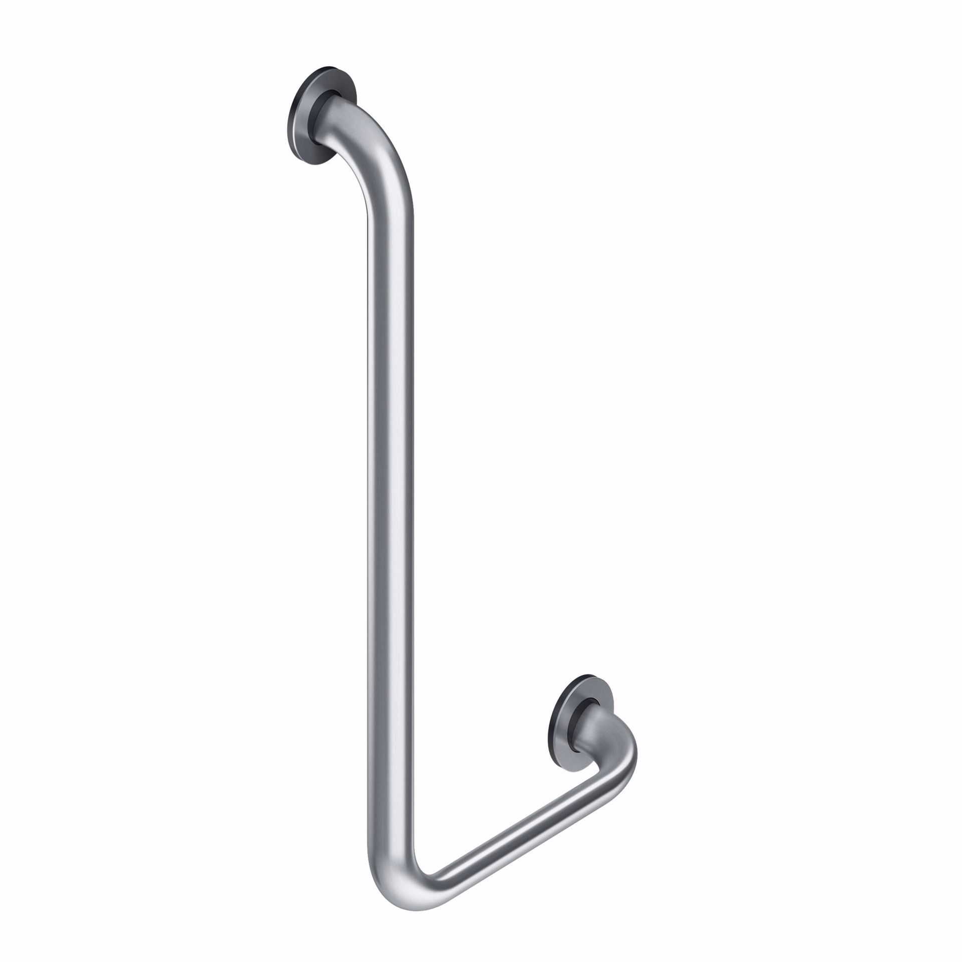 Haltegriff aus Edelstahl fein matt, als 90°-Winkelgriff, für Dusch- und WC-Bereich, für optimales Greifen und Stützen, Handgreifform elliptisch durch Ovalrohr 36,5 x 22 mm mit 45°-Schrägstellung, verdeckte Befestigung durch Abdeckblenden aus Edelstahl fein matt, Wandhalterungen aus Aluminium schwarz-grau (RAL 7021), Ø 70 mm, inkl. Befestigungsmaterial für massives Mauerwerk.