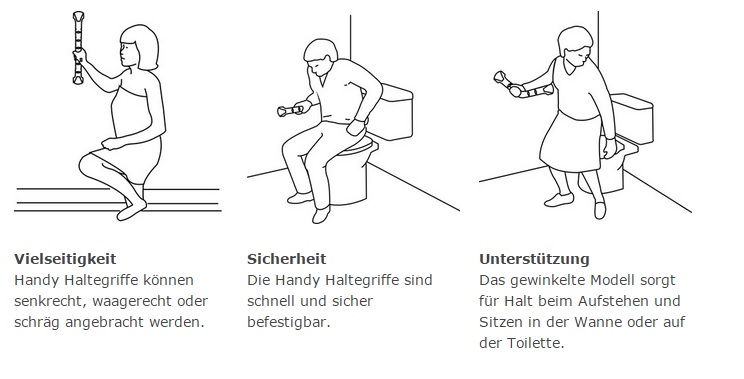 Die Haltegriffe sind bis zu 160 kg belastbar und somit sehr stabile Produkte, die zudem zahlreiche Einsatzmöglichkeiten bieten. Mittels Dübeln können sie an fast jeder Wand sicher und leicht befestigt werden. Sie haben ein dezentes Design und geben dort sicheren Halt, wo es nötig ist – z. B. auf der Toilette das normale Hinsetzen und Aufstehen. In der Badewanne, wo es oft rutschig ist, verhindern die Griffe den Unsicherheitsmoment beim Ein- und Aussteigen. Die geraden Haltegriffe gibt es in den Längen 30, 40 und 60 cm. Sie können senkrecht, waagerecht oder auch schräg angebracht werden. Alle Handy Haltegriffe sind antirutschbeschichtet und bieten somit sicheren und festen Halt. Ein schönes und zugleich zweckmässiges Design ohne scharfe Kanten und freiliegende Schrauben runden das Bild ab.