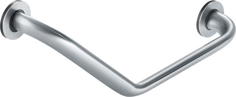 Haltegriff aus Edelstahl fein matt, als 135°-Winkelgriff, für Dusch- und WC-Bereich, für optimales Greifen und Stützen, Handgreifform elliptisch durch Ovalrohr 36,5 x 22 mm mit 45°-Schrägstellung, verdeckte Befestigung durch Abdeckblenden aus Edelstahl fein matt, Wandhalterungen aus Aluminium schwarz-grau (RAL 7021), Ø 70 mm, inkl. Befestigungsmaterial für massives Mauerwerk.