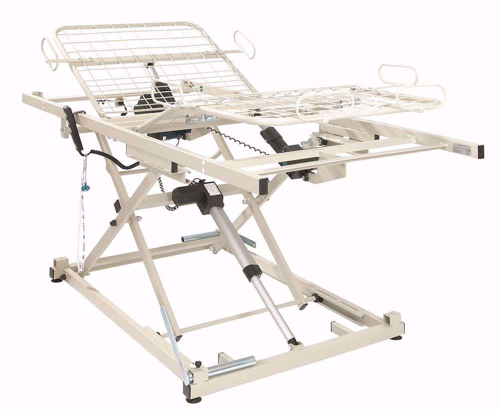 Die viergeteilte Liegefläche kann individuell über einen Handschalter in verschiedene Positionen eingestellt werden. Eine spezielle Unterschenkelhochlagerung sorgt dabei für zusätzlichen Komfort, und durch den breiten Höhenverstellbereich lässt sich der Rahmen optimal an die Arbeitshöhe der Pflegekraft anpassen, was eine rückenschonende Handhabung fördert.