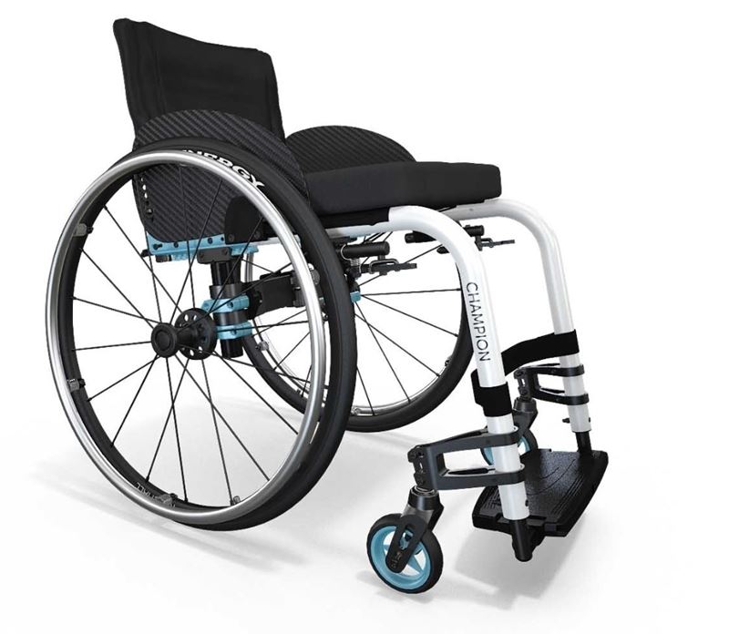 Konfiguration: Der abgebildete küschall Champion besteht aus einem Standard-Aluminium-Rahmen in Weiß mit einem CPS in Artic-Blau, hochschwenkbarem Carbon-Seitenteil-Kleiderschutz, mit Standard-Rückenpolsterung, Performance-Bremsen, 4" Starec-Vorderrädern, High-Performance Hinterräder mit Schwalbe Marathon Bereifung und Extra-Grip-Greifreifen "The Surge".