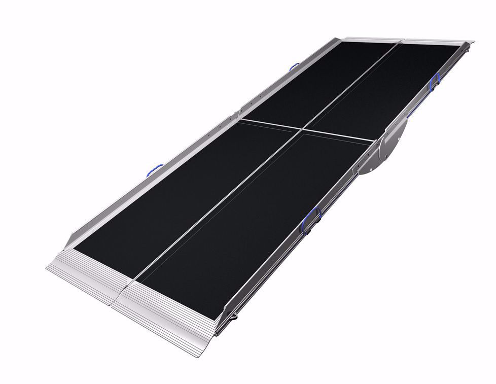 Die AeroLight-Lifestyle Rampe ist eine zweifach faltbare Rampe mit einer Laufflächenbreite von 740 mm und einer Belastbarkeit von bis zu 350 kg. Sie eignet sie sich für Elektro-Rollstühle, manuelle Rollstühle oder Rollatoren. Wenn die Spurbreite mal nicht reicht oder Sie nur eine Spur benötigen, kann die Rampe zweigeteilt werden. Durch einfaches Zusammenfalten und einem geringen Gewicht, eignet sie sich hervorragend für die Mitnahme auf Reisen. Für sicheres Auf- und Abfahren sind die Enden der Rampe gewölbt und mit einer AntirutschBeschichtung an der Unterseite versehen. Hohe Sicherheit beim Befahren oder Begehen bietet Ihnen auch der rutschfeste Belag der Lauffläche.