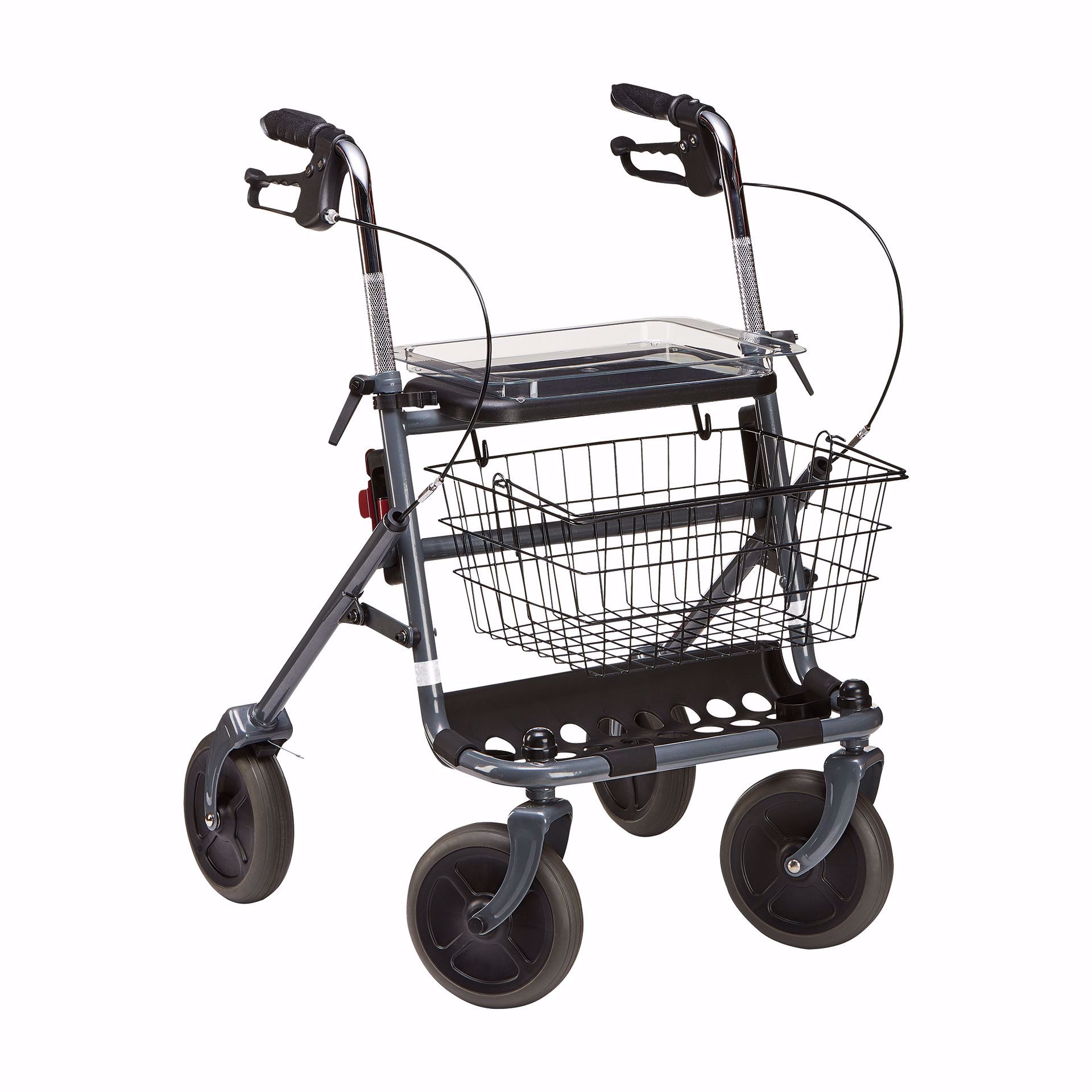 Praktische Details wie der inkludierte Einkaufskorb und das Acryltablett mit einer Belastungsgrenze von jeweils 5 kg bieten zusätzlichen Nutzen im Alltag. Die leicht zu reinigende Kunststoffablage ermöglicht zudem den sicheren Transport von Gegenständen bis zu 7 kg. Der beidseitig montierbare Stockhalter komplettiert die durchdachte Ausstattung dieses hochwertigen Rollators.