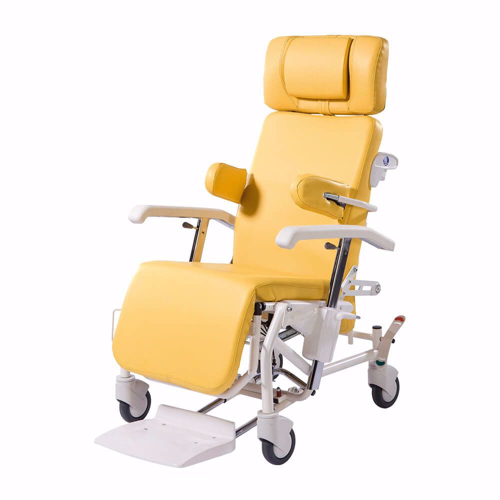 Pflegestuhl mit hydraulisch verstellbarer Rückenlehne und Sitzkantelung, sowie manuell einstellbarer Beinauflage. Das Fussbrett lässt sich nach Wunsch ein- oder ausziehen. Die höhenverstellbaren Armlehnen lassen sich für einen seitlichen Transfer komplett absenken. Die Schaumstoffpolsterung von Sitz und Rücken unterstützen das ermüdungsfreie Sitzen und Lagern.