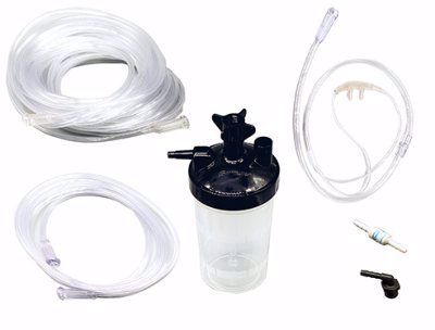 Das Set besteht aus Sprudelanfeuchter, Nasenbrille (0,3 m), Sauerstoff-Schlauch (2,1 m), Sauerstoffschlauch (10 m), FireSafe® Cannula und Winkelstück.