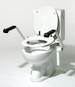Stabile, manuell höhenverstellbare Toilettensitzerhöhung mit Armlehnen. Anatomisch geformter Sitz mit leichter Neigung nach vorne. Schnell montierbar an allen gängigen Toilettenschüsseln, ausgenommen Dusch-WC's.