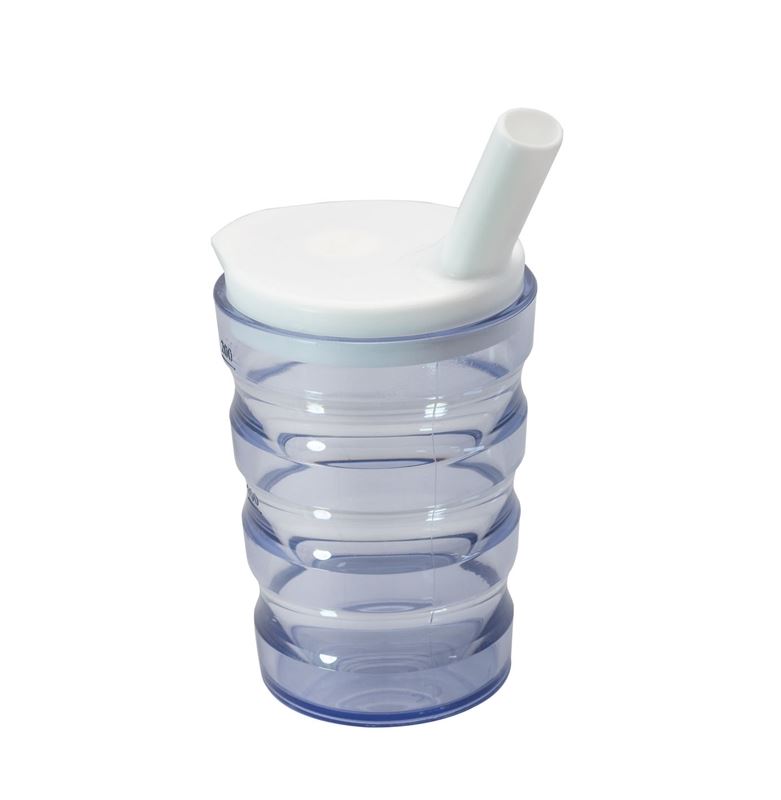 Das Silikon-Ventil im Deckel regelt den langsamen Durchfluss und verhindert bei einem Umstossen des Bechers ein Auslaufen. Durch die Vertiefungen ist der Becher gut zu umgreifen.